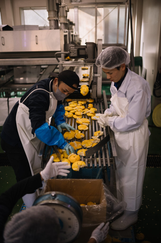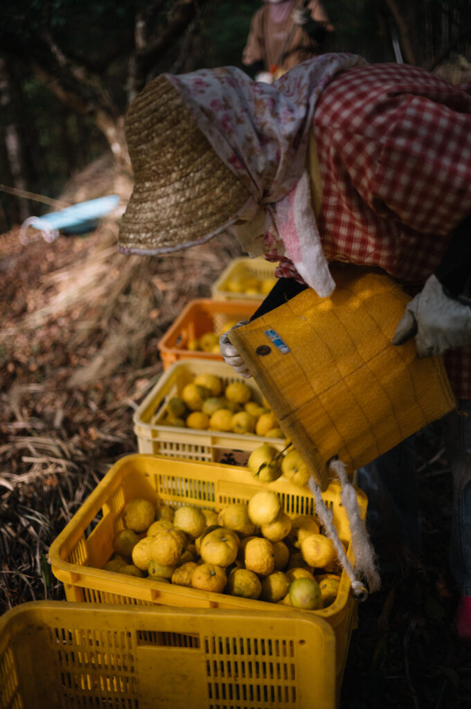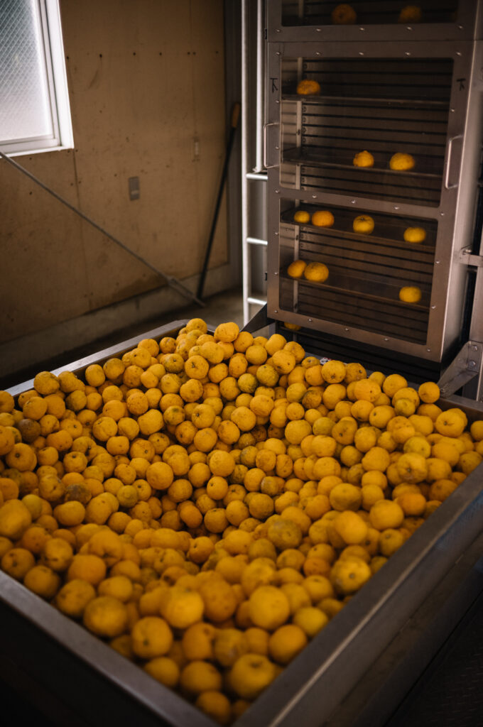 収穫されたゆずは地元JAに出荷され、近くの搾汁工場でゆず酢(ゆず果汁)へ加工されます。家族で育てた有機ゆずは、地元の加工所を通じてポン酢などをつくる県内外のメーカーへ届けられています。