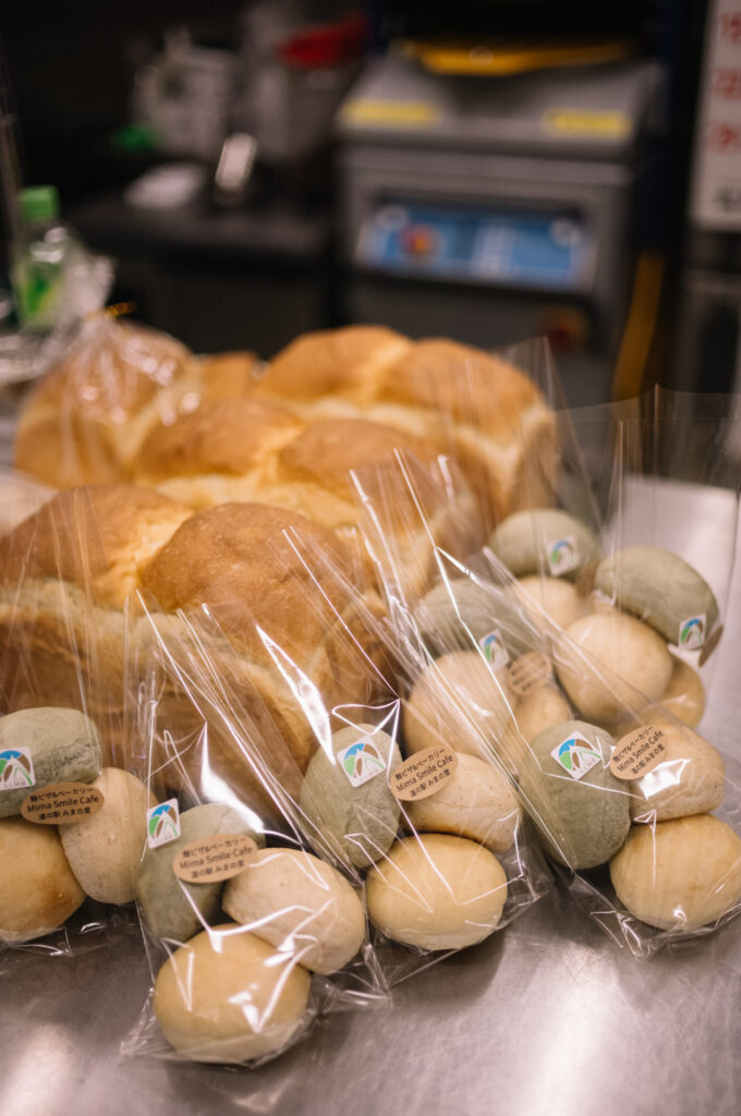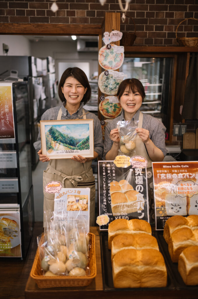 道の駅みまの里にあるパン屋「Mima Smile Cafe(ミマスマイルカフェ)」。共同経営の一井郁子さんと藤澤久美さんが、地域の食材を生かしたパンづくりに取り組んでいます。いずれも栄養士としての経験を持つ二人は、店舗運営に加え、料理教室や「あかちゃん食堂」も開き、子育て世代が気軽に集えるコミュニティの場を育んできました。食や健康の話をきっかけに、日々の悩みや経験を分かち合えるつながりが生まれています。